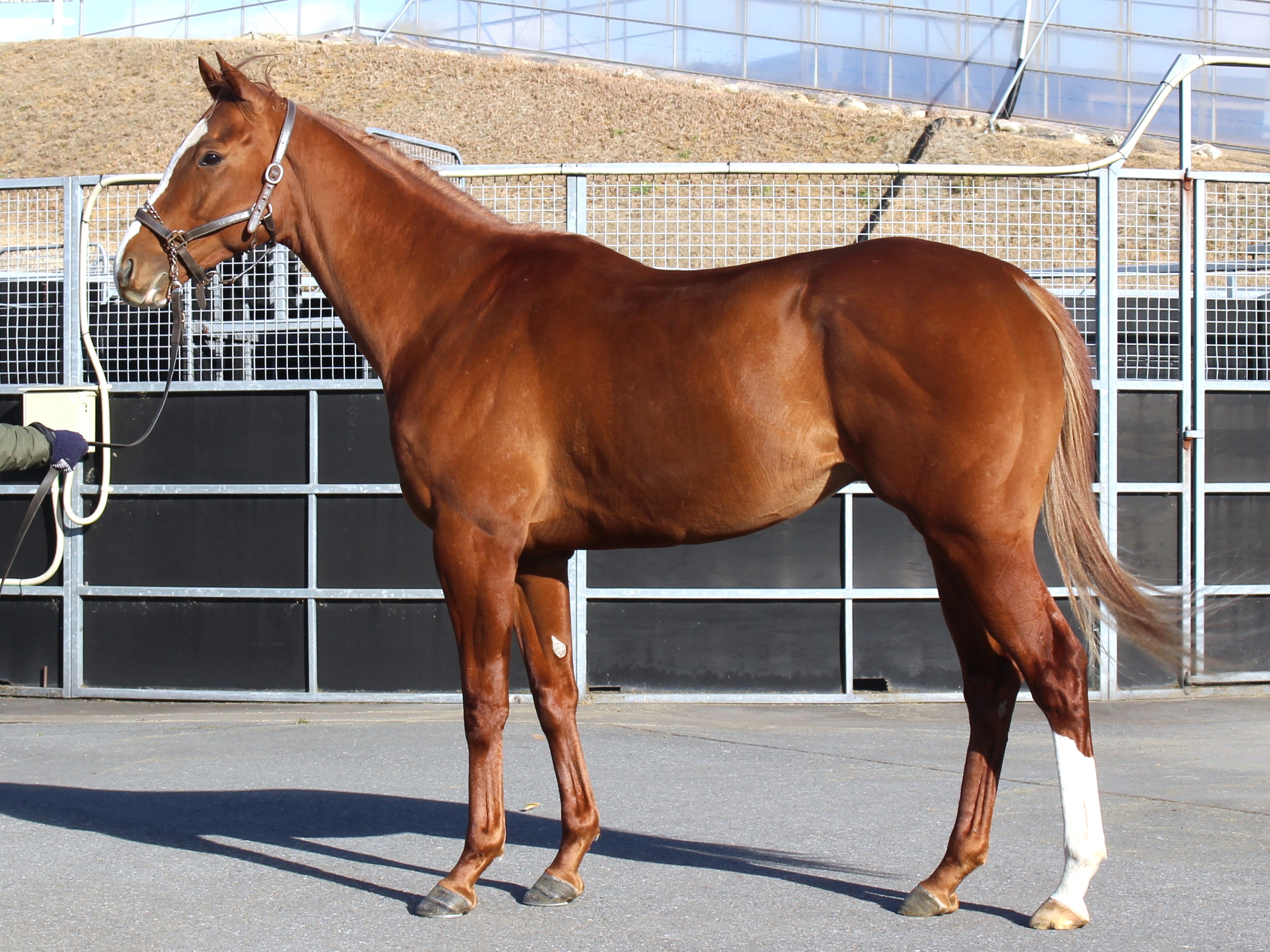 場長は「既にブレーキングを終えて坂路コースでの騎乗調教まで進めています。人を乗せて走ることを覚えさせている段階で、集団調教を中心にキャンターで駆け上がっています。とてもバランスの良い走りでセンスを感じます。柔らかすぎるところもなく現時点で芯の通った体幹をしているのかもしれません。本格的なトレーニングはこれからですが、引き続き育成を進めていきます。」とコメントしています。