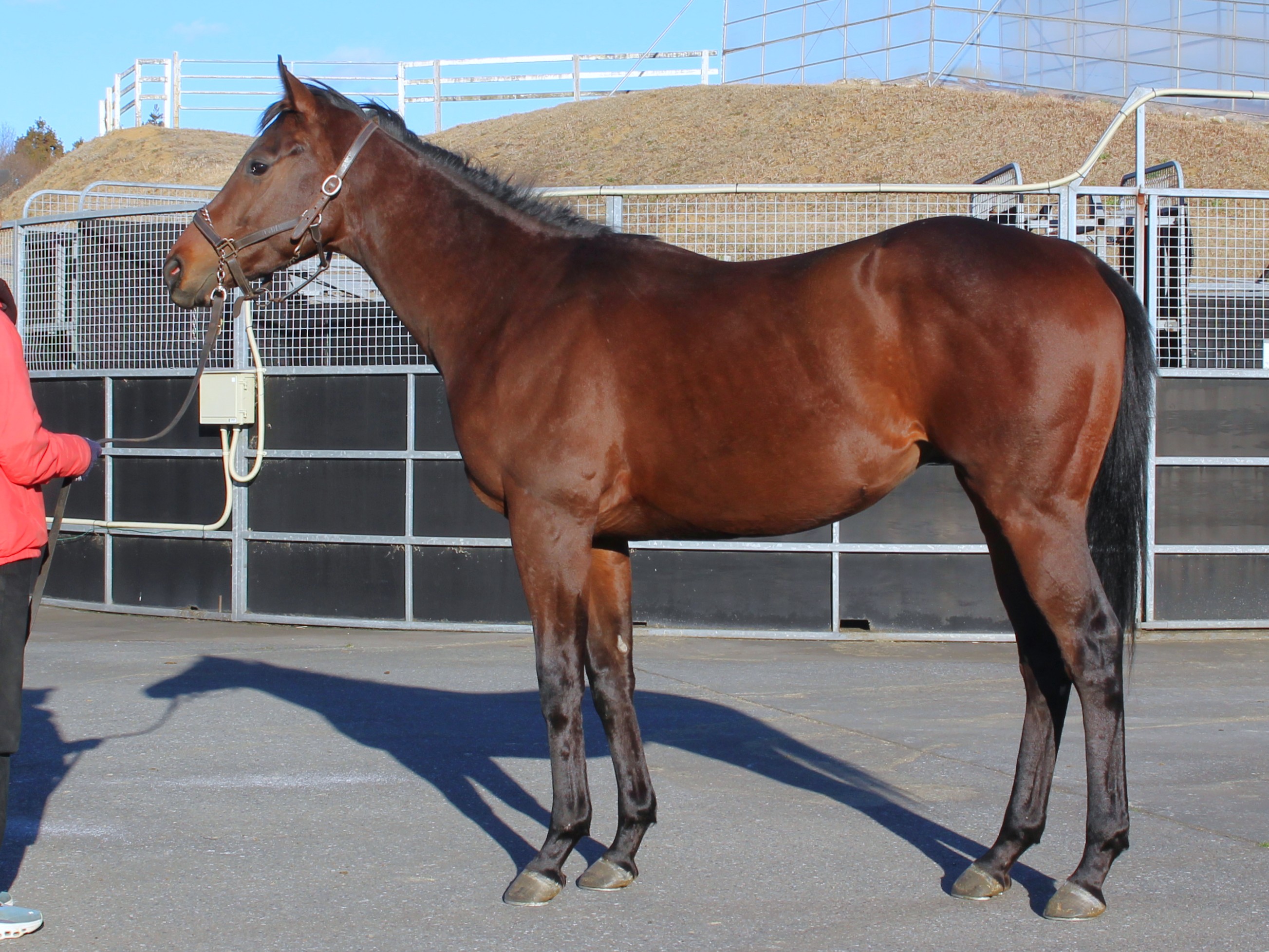 場長は「扱い易い素直な性格もあってブレーキングもスムーズに進められました。既に坂路コースに入っています。脚捌きが軽快で運動神経の高さを感じます。体幹が強く筋力もあると思われ、急坂を駆け上がっていく中でも走りに安定感があります。期待のベンバトルとの配合で兄弟では一番の出来ではないでしょうか。鍛えていくのが楽しみな1頭です。」とコメントしています。