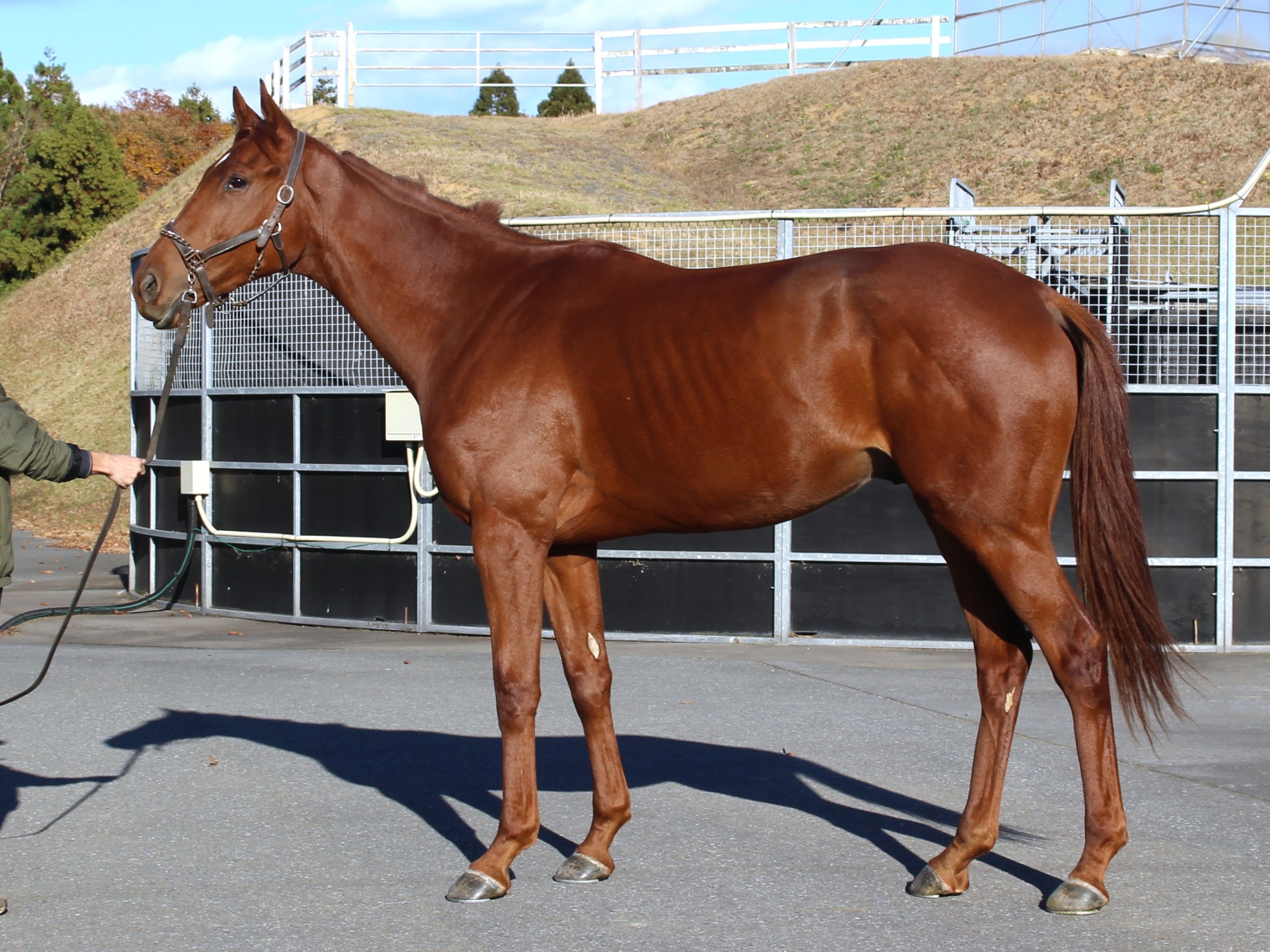 主任は「放牧地から集牧する際などに逃げ回って掴ませないなど、性格的には少し神経質な面が見受けられますが、競走の観点からは反応が良いとも言えます。脚が長めですし数字以上に馬体を大きく見せるので、他馬よりも成長幅が大きいのではないでしょうか。先ずはブレーキングを進め準備が整い次第、坂路コースで騎乗調教を進めていきます。」とコメントしています。