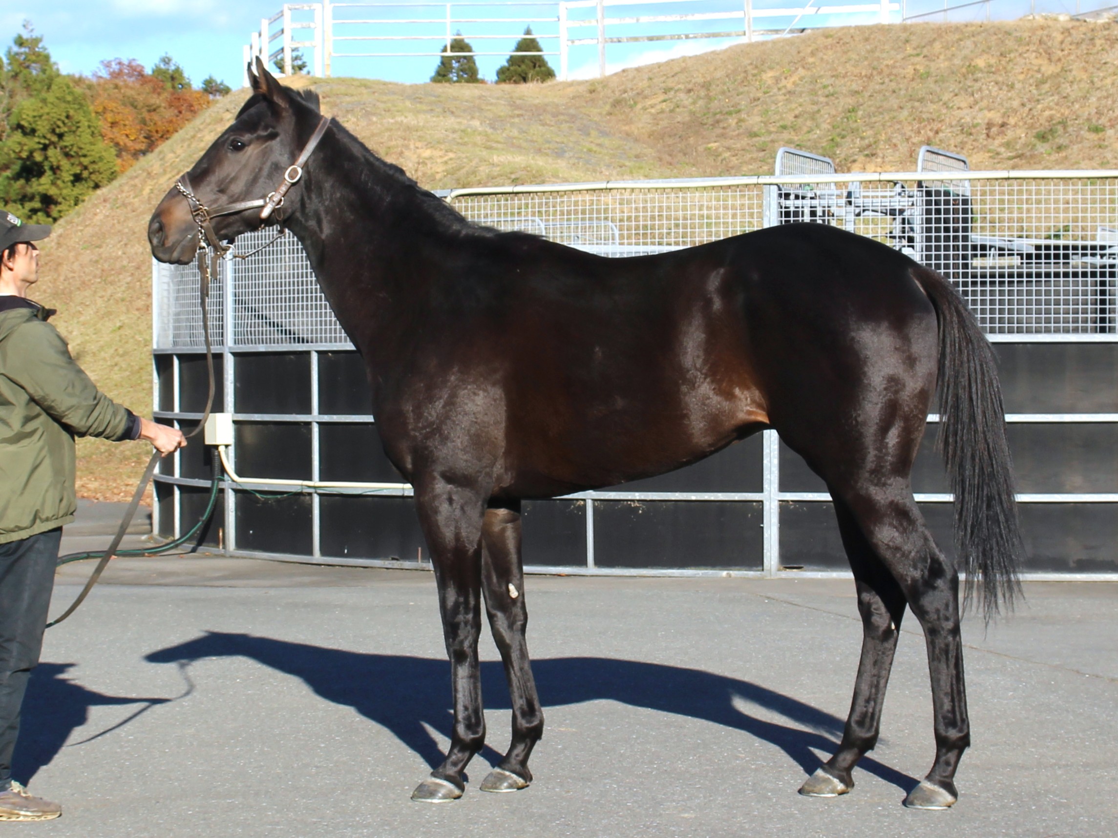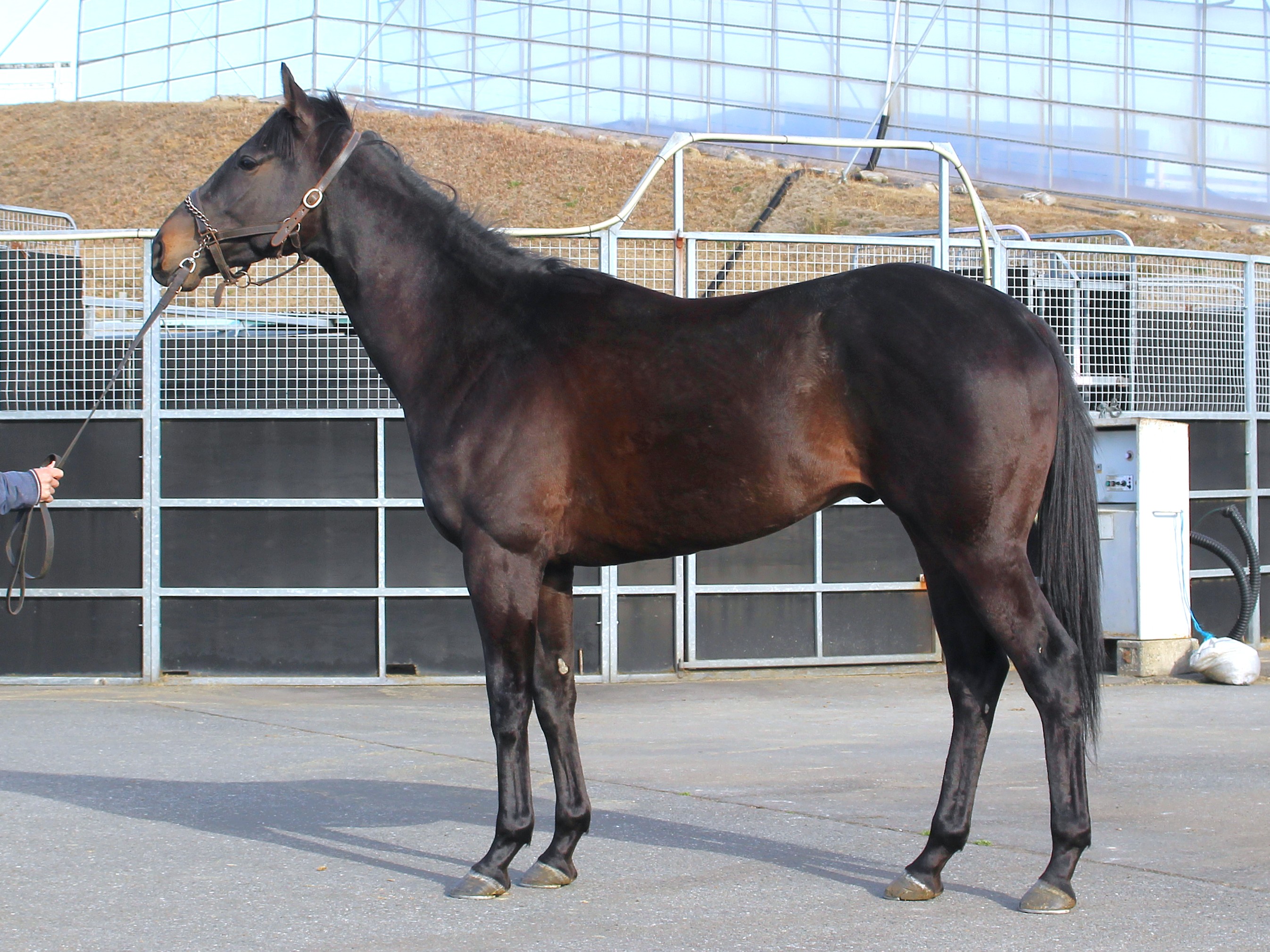 場長は「現在ブレーキングに備えてサイドレーンを装着しウォーキングマシーンでの運動を行っています。装着馬具も抵抗なく受け入れており順調に進んでいます。繊細で物事に対する反応が早く、一瞬の動きに運動神経の高さを感じます。兄よりも逞しい馬体をしていますし、スピードとパワーを兼ね備えていると思います。近日中に本格的な馬装と騎乗馴致を進めていく予定です。」とコメントしています。