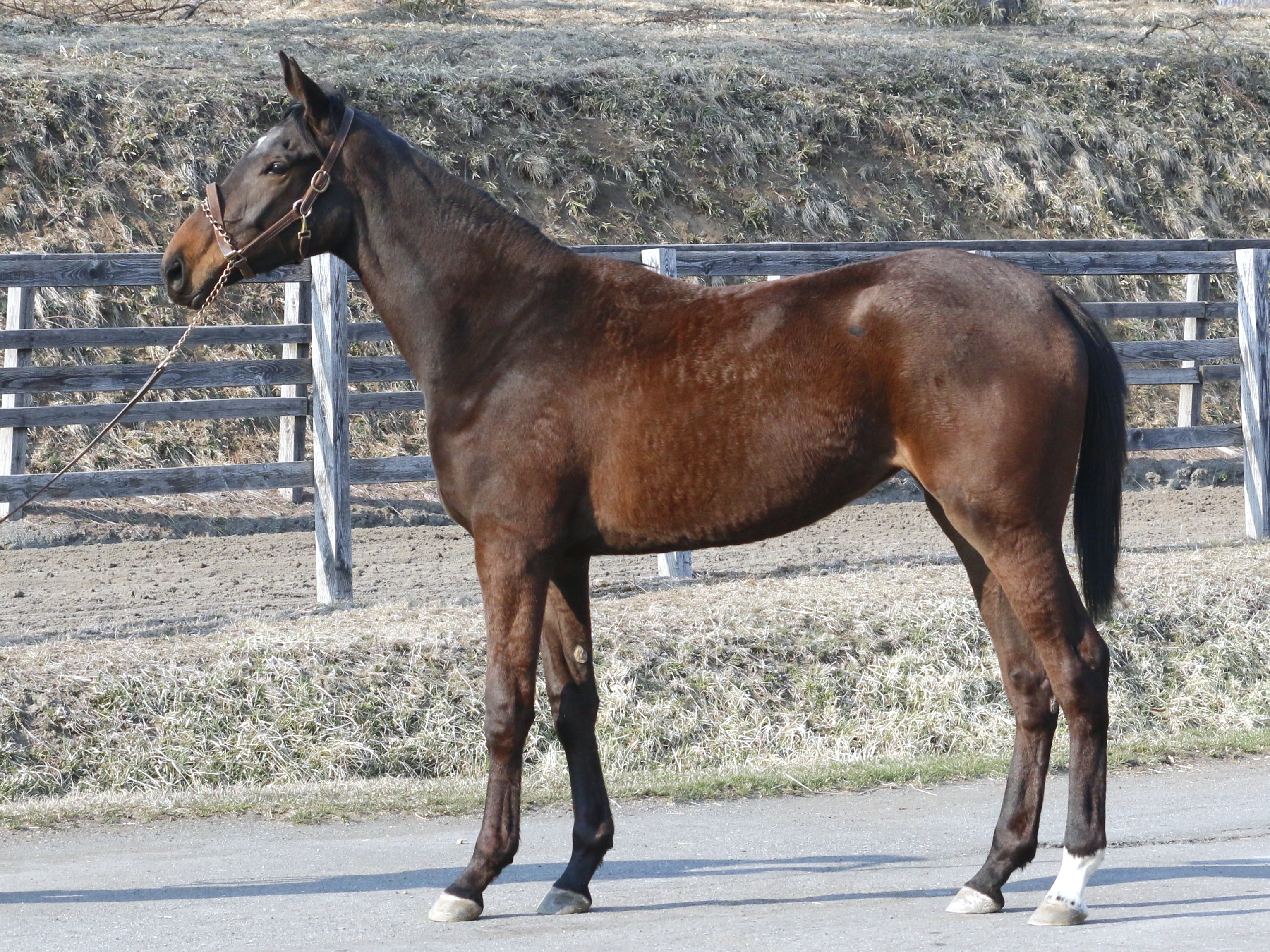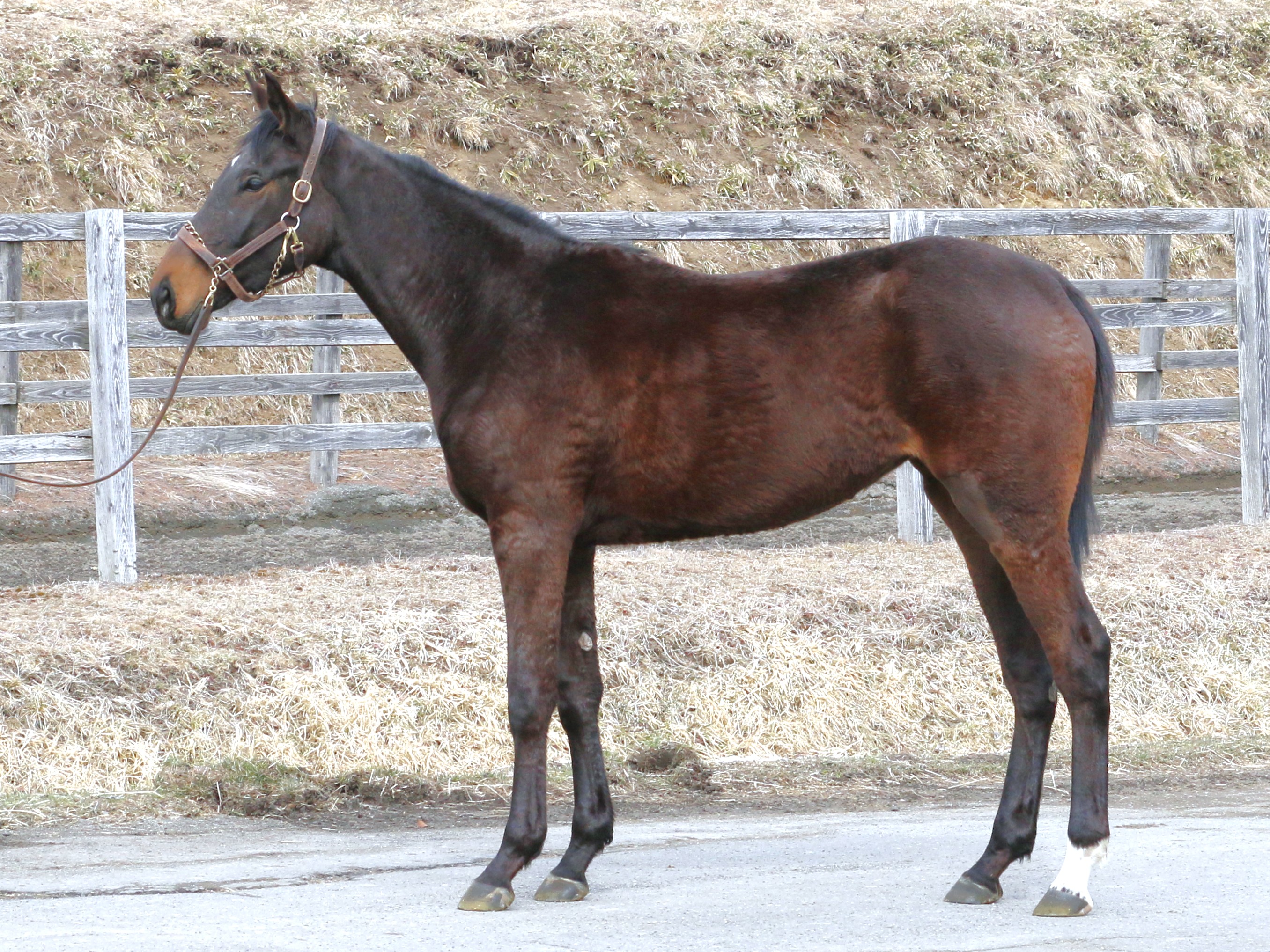 場長は「引き続き坂路コースで乗り込んでいます。左後肢の膝蓋骨はその後外れることも無く、歩様も改善されつつあります。順調に乗り込むことができており、徐々に筋肉も付いてきているのではないでしょうか。調教の動きは上々ですが、体高の割に中々馬体に幅が出てきていないところです。このまま乗り込んで幅が出てくると更に良くなってくると思います。このまま進めていきます」とコメントしています。